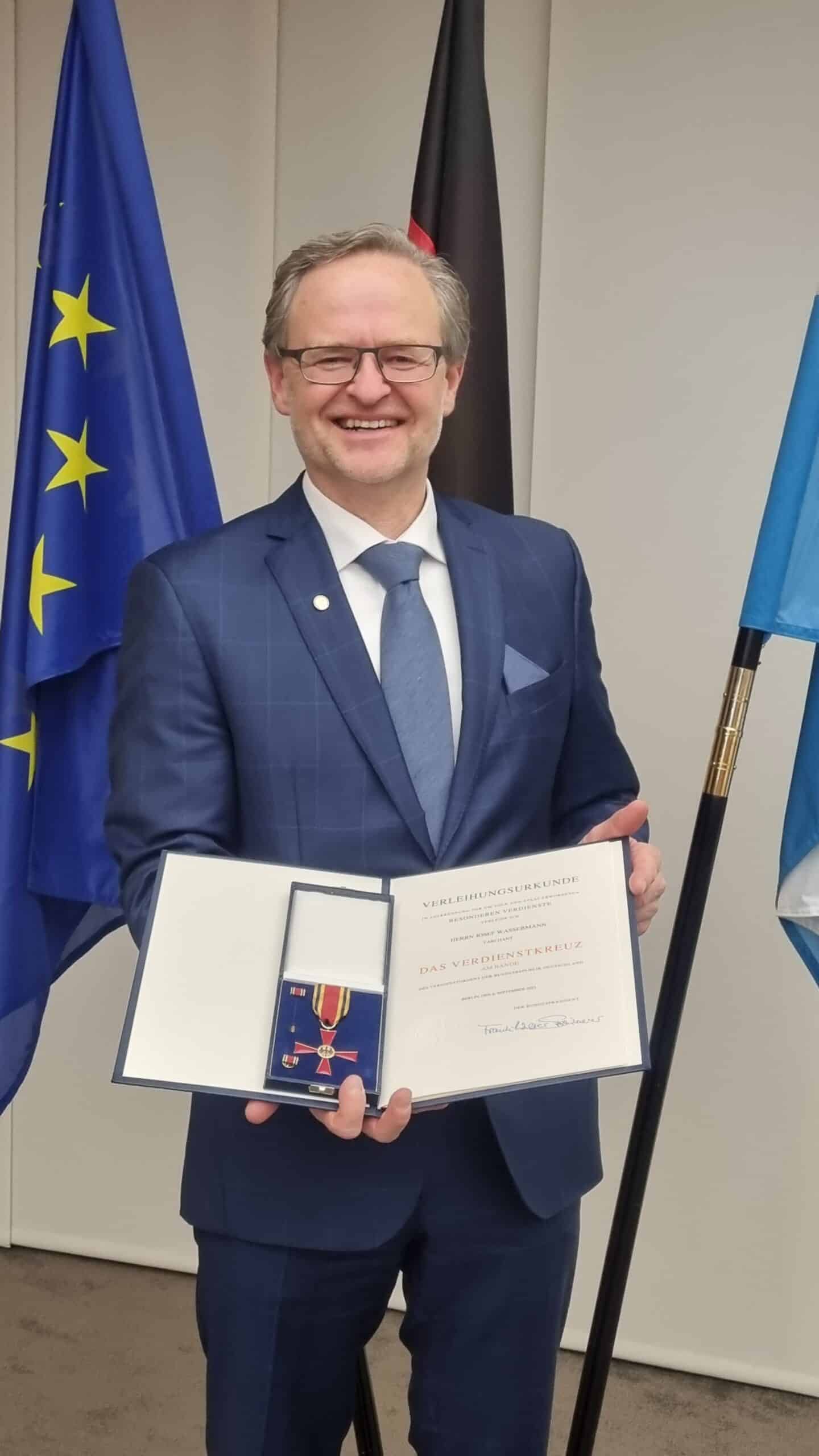 Auf Grund des jahrelang, erfolgreichen Projektes „Werdenfelser Weg“ und dem Engagement freiheitsentziehende Maßnahmen in Pflegeeinrichtungen zu vermeiden, wurde er am 20. Februar mit dem Bundesverdienstkreuzes am Bande geehrt.